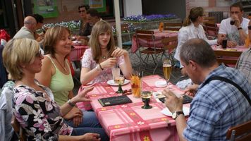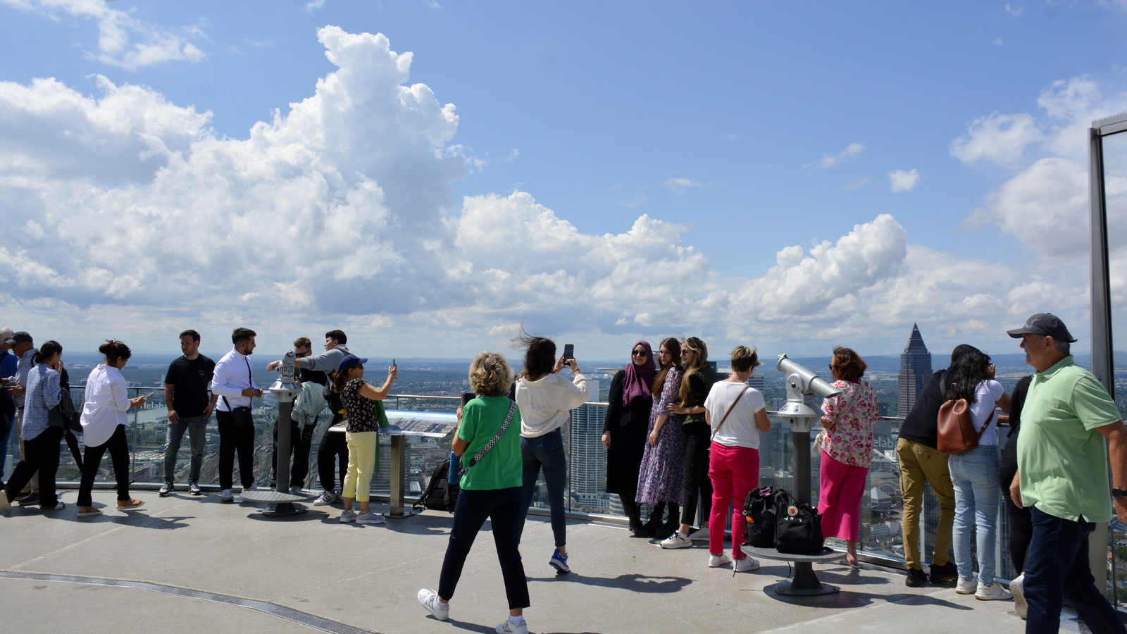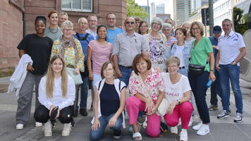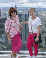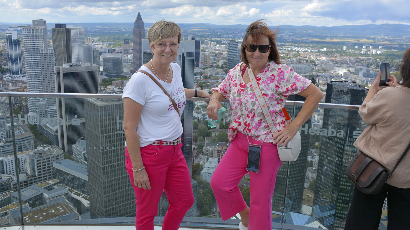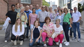 Frisch gestärkt durch unser Sektfrühstück (leider ohne Beachball) erreichten wir die Mainmetropole. Auf dem Maintower konnten wir uns einen grandiosen Überblick über die gesamte Stadt verschaffen. Der danach von unserer ortskundigen Kathrin durch die Stadt geführte Rundgang war sehr interessant und kurzweilig. Nach Einchecken und einer kurzen Relax-Pause in unserem Hotel, ging es am Abend nach Sachsenhausen, wo wir in einem der bekanntesten Gasthäuser einkehrten und den Eppelwoi (teilweise in "Bembel" Mengen) probierten. Der Rückweg (mehrere 500 m) zu Fuß oder auch mit dem Bus führte uns vom belebten Mainufer quer durch die Stadt sowohl am Römer, am Hauptbahnhof, wie auch an der Messe vorbei zu unserem Hotel. Nach einer erholsamen Nacht und nach dem Frühstück vertiefte und festigte der Stadtführer unsere bereits erhaltenen Kenntnisse von Frankfurt während der verregneten Rundfahrt. Pünktlich mit Ende der Stadtbesichtigung strahlte die Sonne wieder und unserem Palmengartenbesuch stand nichts mehr im Wege. Mit vielen Eindrücken von einer Banken- und grünen Großstadt-Metropole machten wir uns auf den Rückweg. Dieser führte uns über das schöne und historische Pfälzer Örtchen Freinsheim, wo wir unser gemeinsames Abendessen genießen konnten.