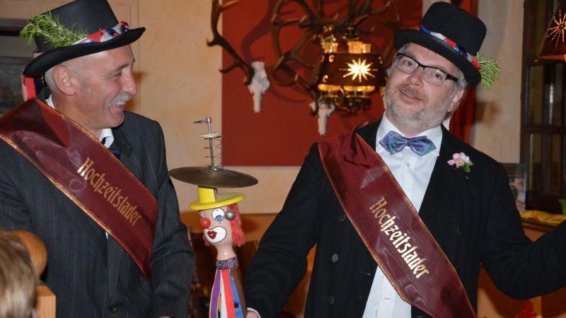 Mit einem feinen 4-Gang-Menu wurden die verbrauchten Kalorien wieder ersetzt. Unsere Nimmermüden konnten noch zwei Odenwälder Originale erleben. Die „Hochzeitslader“ überbrachten in Reimen ihre Einladung für das Brautpaar an die Gäste und wurden natürlich auch mit Flüssigem belohnt.