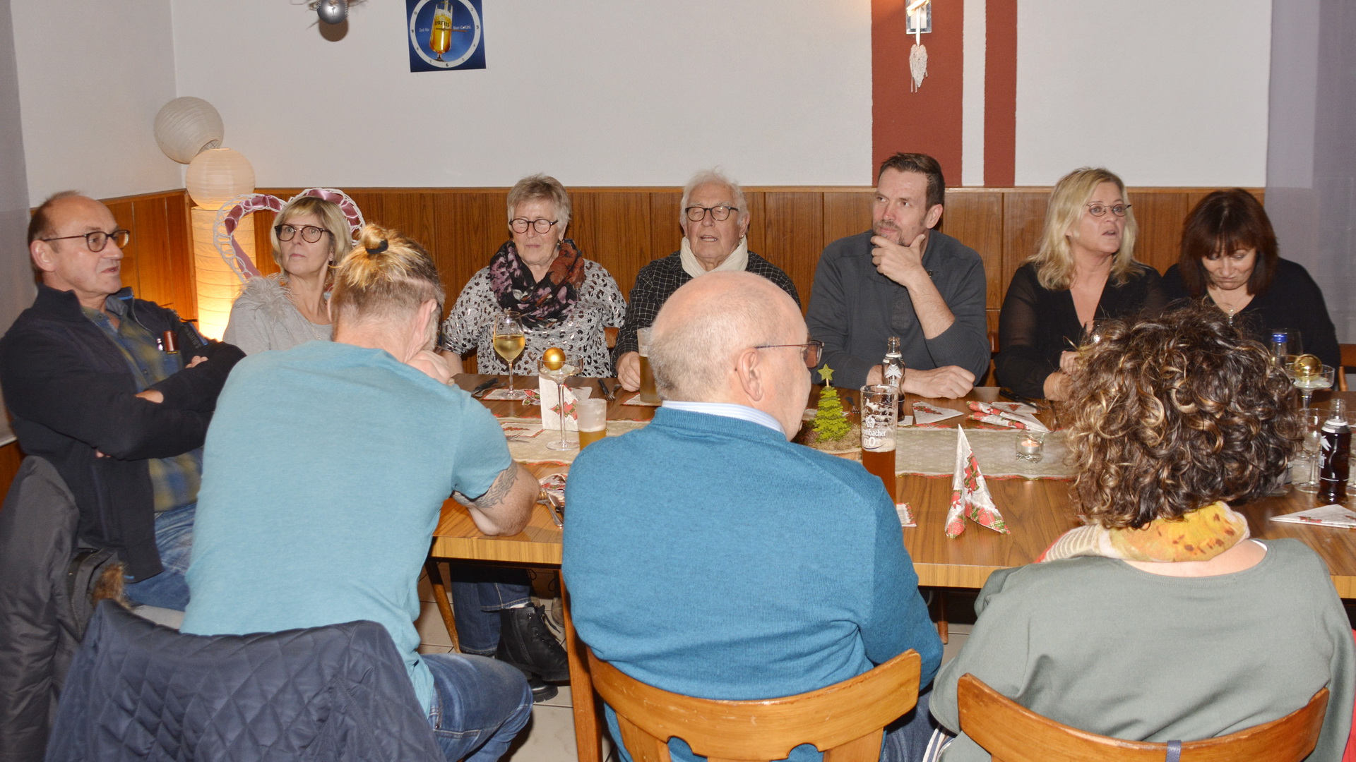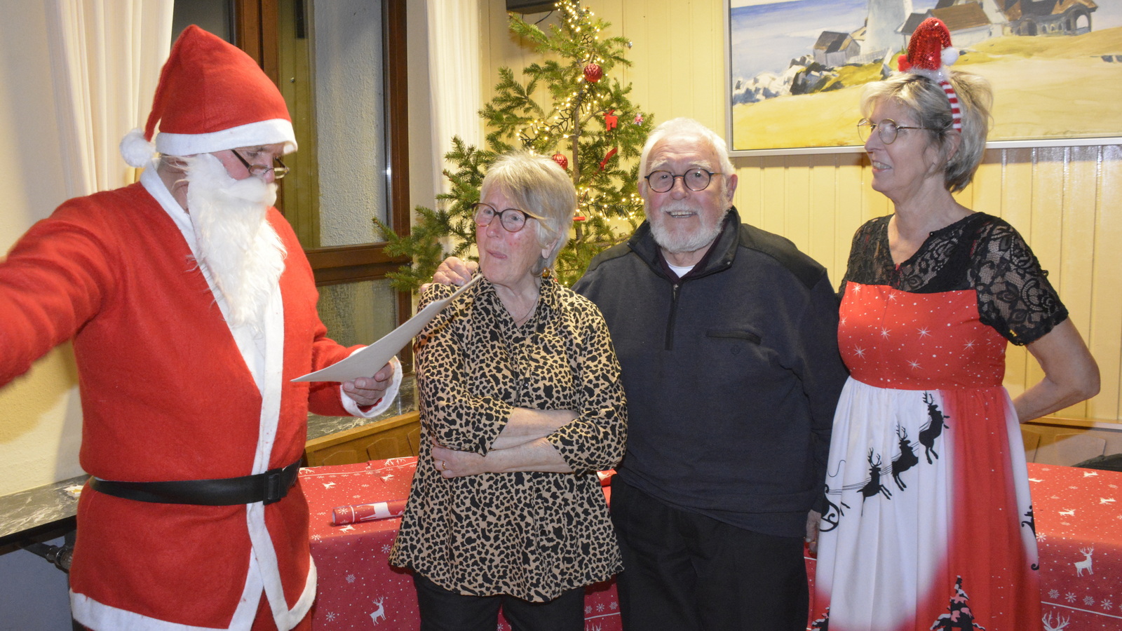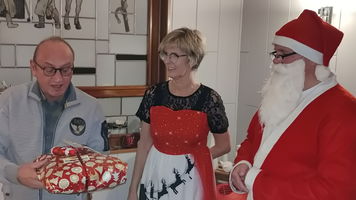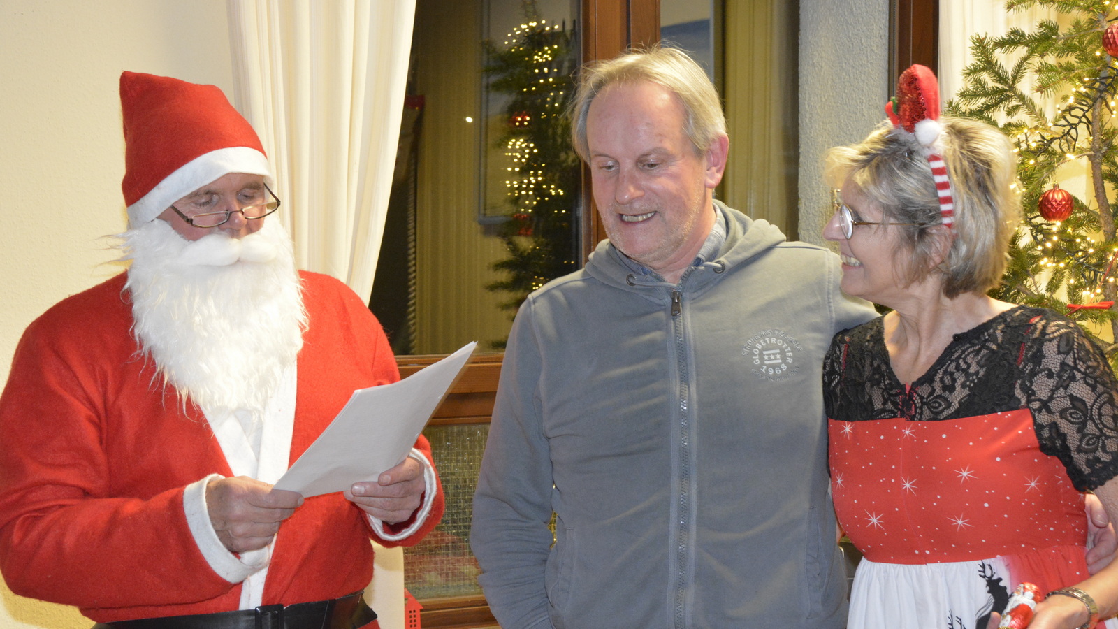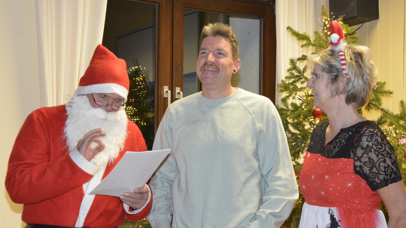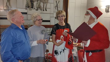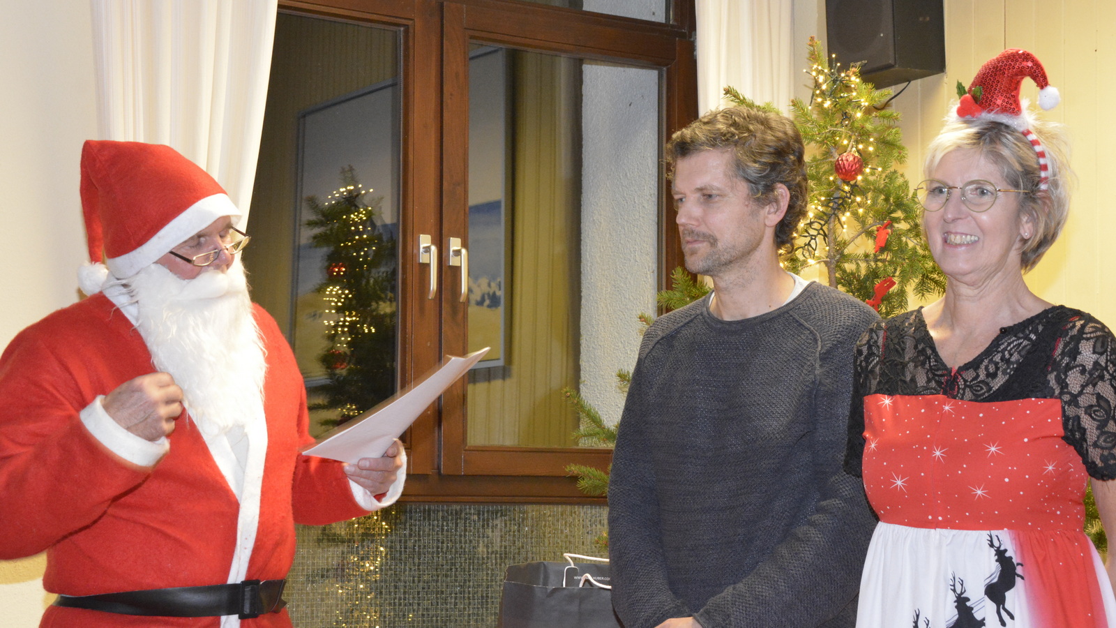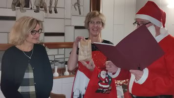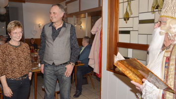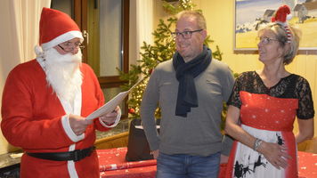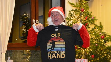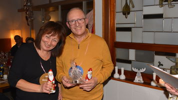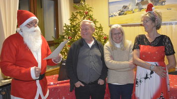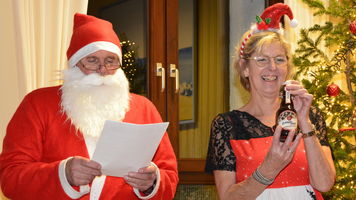 Zu der anschließenden Weihnachtsfeier hatte sich auch Santa Claus mit weiblicher Begleitung angekündigt. Sie ließen aber der Truppe Zeit um sich vorab zu stärken. Natürlich kamen sie dann auch nicht mit leeren Händen. Aus seinen Notizen stellte der Nikolaus die kleinen und großen Mängel, wie auch die positiven Ereignisse der einzelnen Spieler in den Vordergrund. Tolle Preise konnte man bei der Tombola gewinnen, die Rita und Thomas vorbereitet hatten. Unser Herbert hatte das Vereinsgeschehen der letzten 40 Vereinsjahre in einer sehr gelungenen Foto- und Dia-Show mit Hilfe von Kathrin auf die Leinwand gezaubert. Folglich wurde viel gelacht und noch lange in den Abend hineingefeiert.