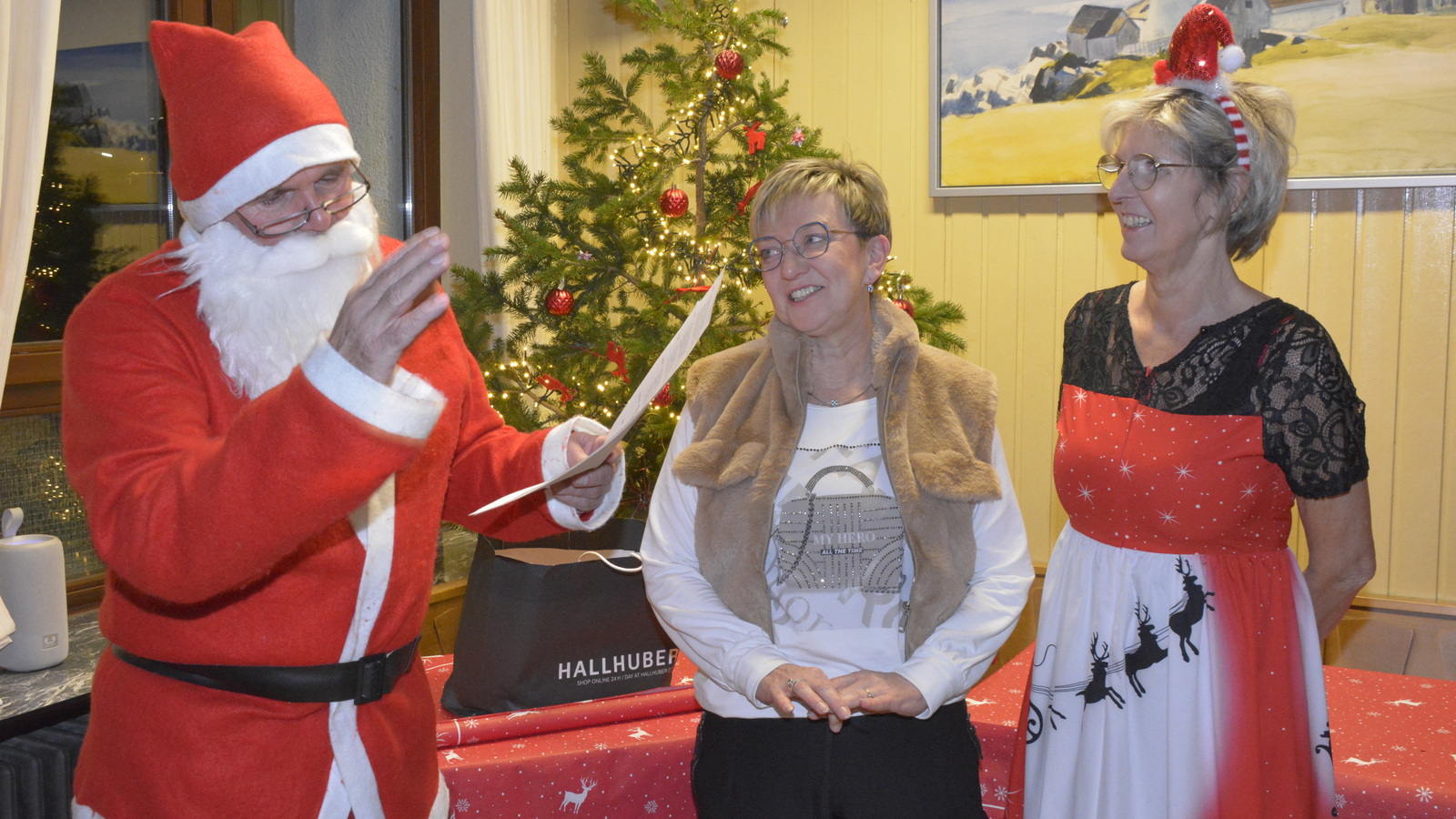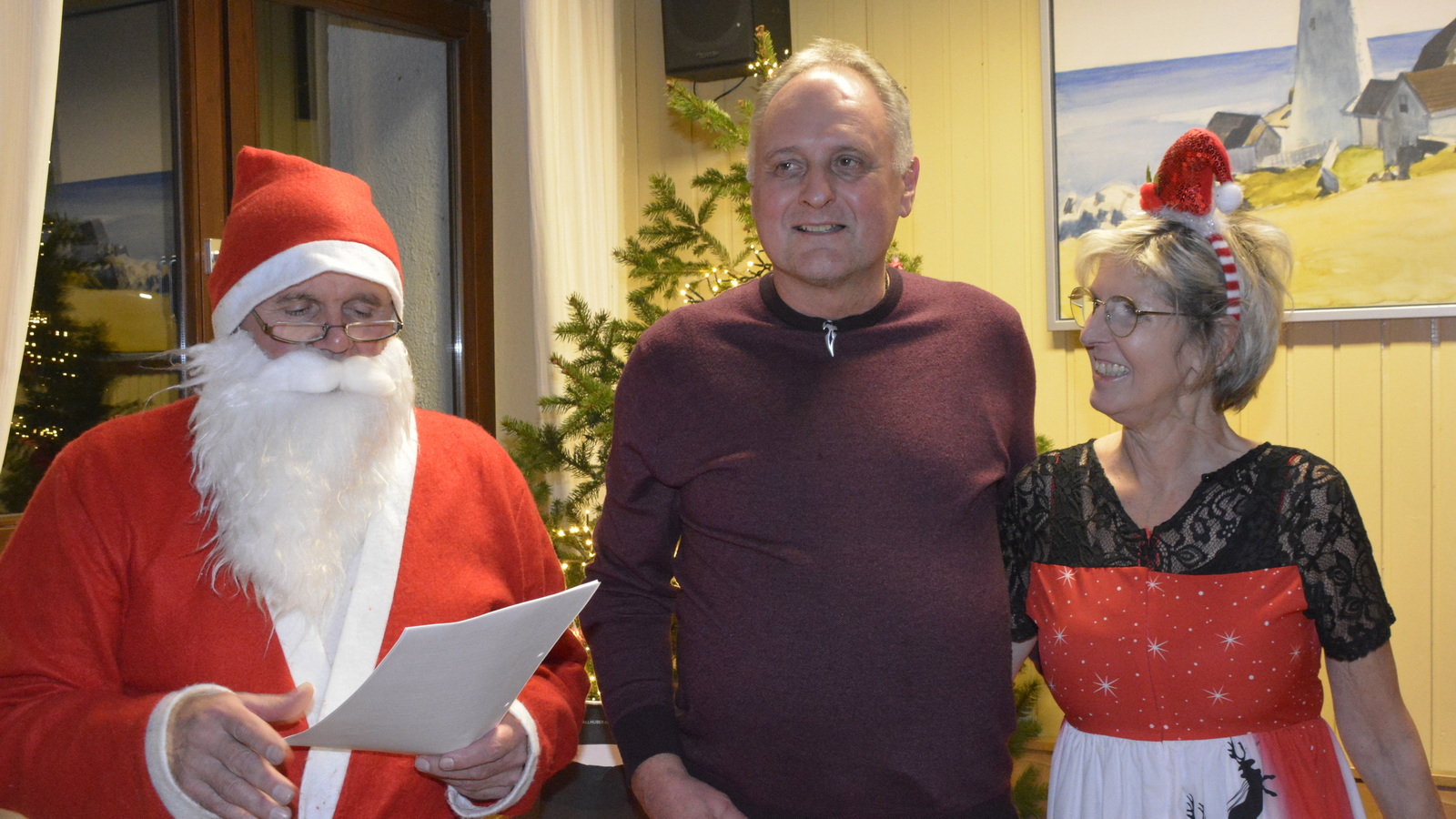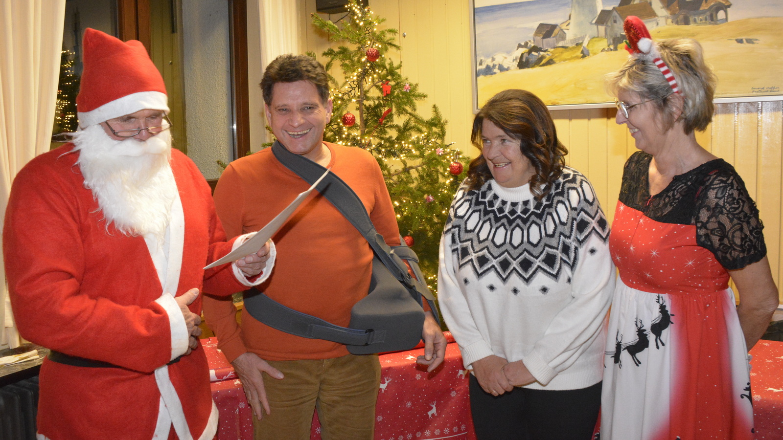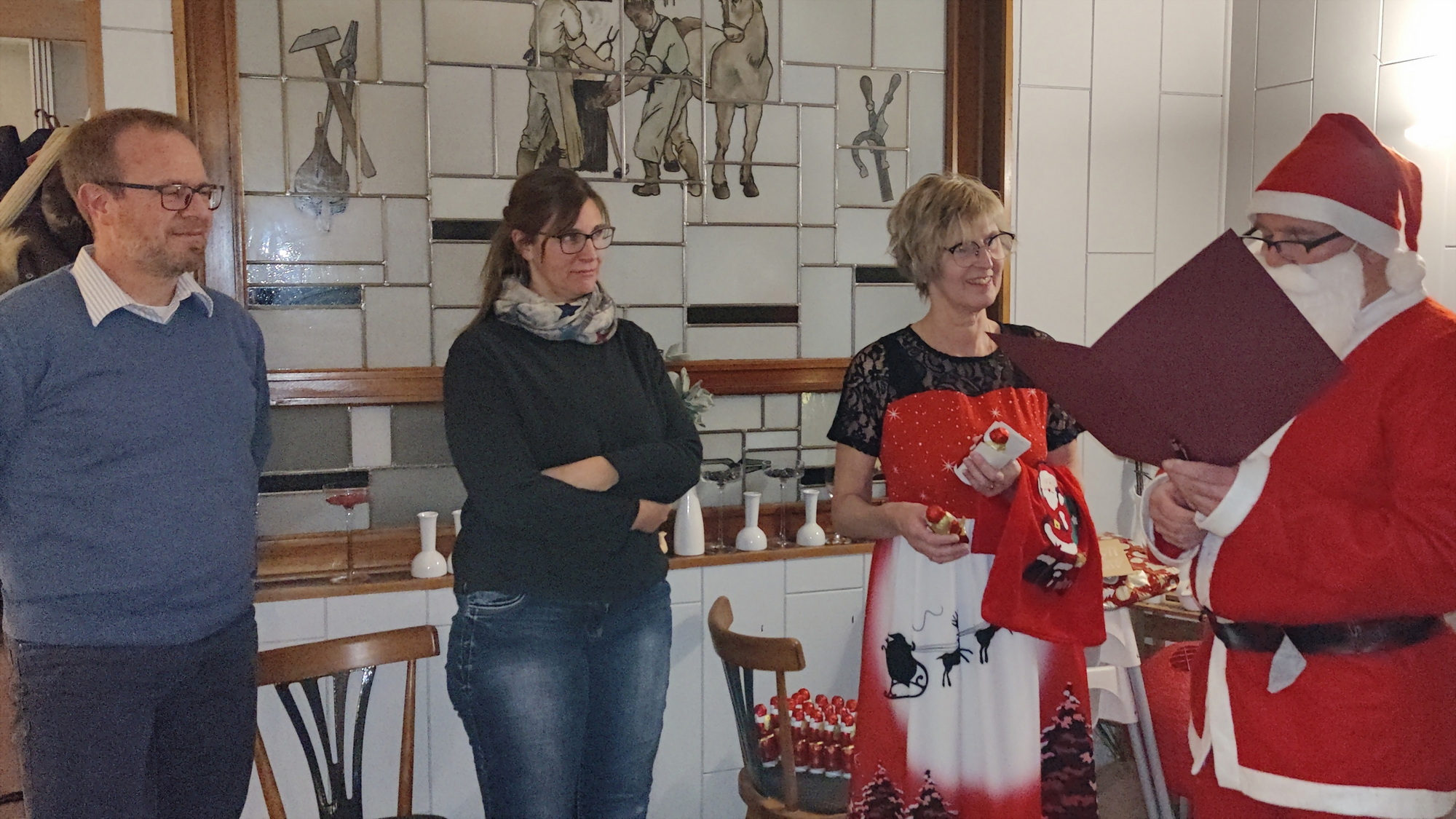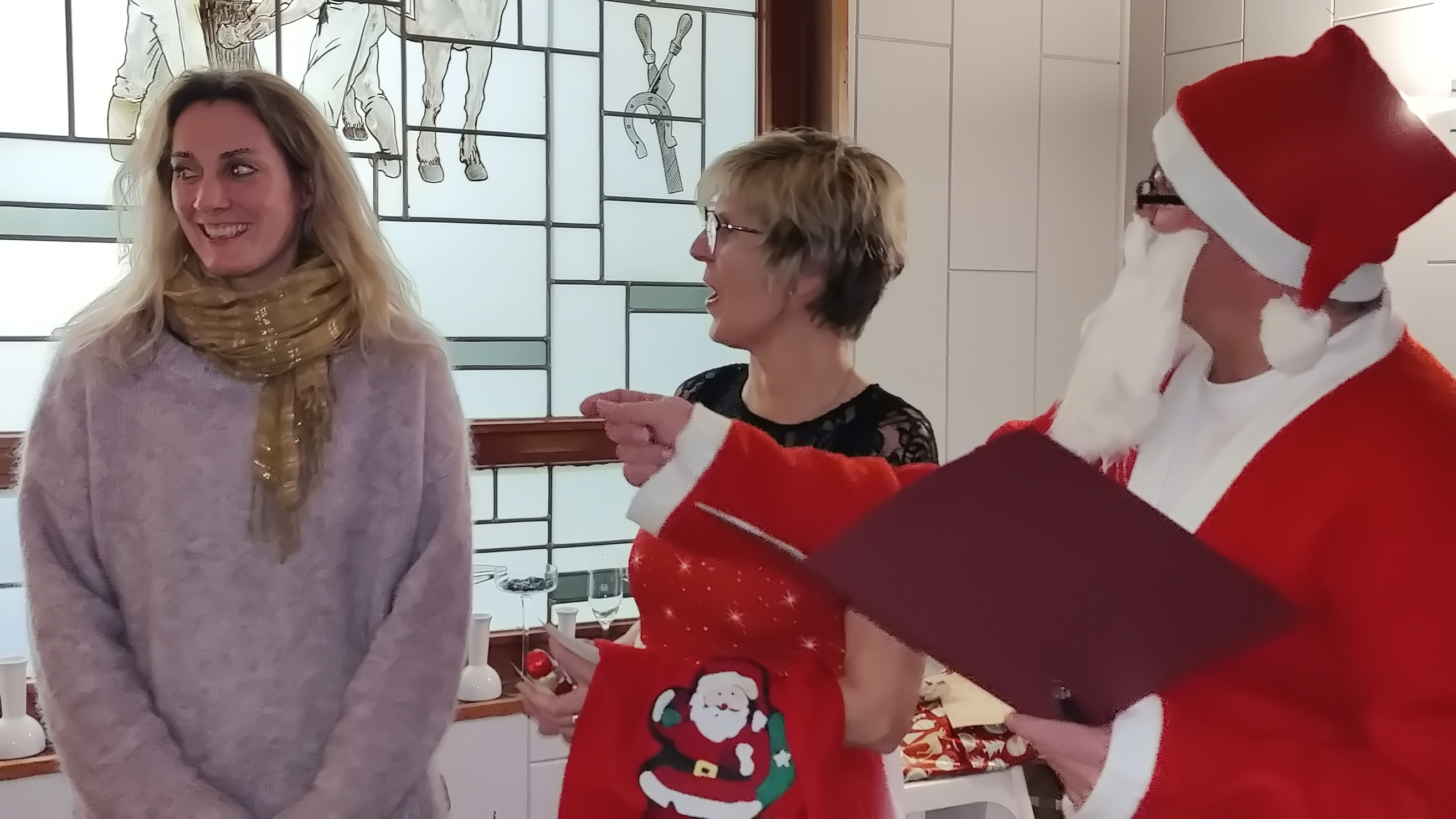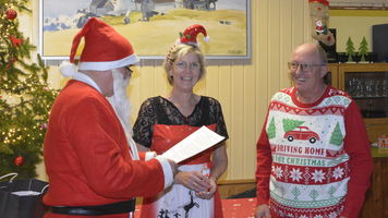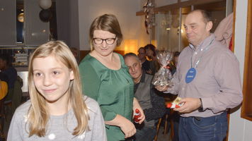 Zu der anschließenden Weihnachtsfeier hatte sich auch Santa Claus mit weiblicher Begleitung angekündigt. Sie ließen aber der Truppe Zeit um sich vorab zu stärken. Natürlich kamen sie dann auch nicht mit leeren Händen. Aus seinen Notizen stellte der Nikolaus die kleinen und großen Mängel, wie auch die positiven Ereignisse der einzelnen Spieler in den Vordergrund. Tolle Preise konnte man bei der Tombola gewinnen, die Rita und Thomas vorbereitet hatten. Unser Herbert hatte das Vereinsgeschehen der letzten 40 Vereinsjahre in einer sehr gelungenen Foto- und Dia-Show mit Hilfe von Kathrin auf die Leinwand gezaubert. Folglich wurde viel gelacht und noch lange in den Abend hineingefeiert.