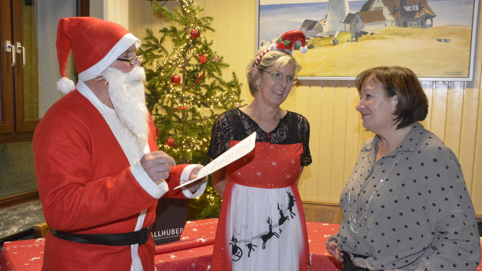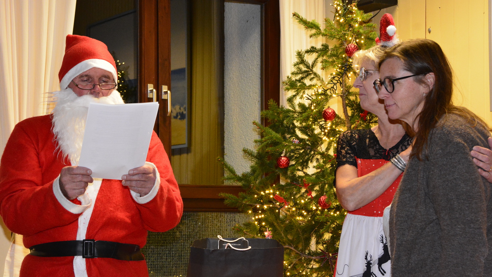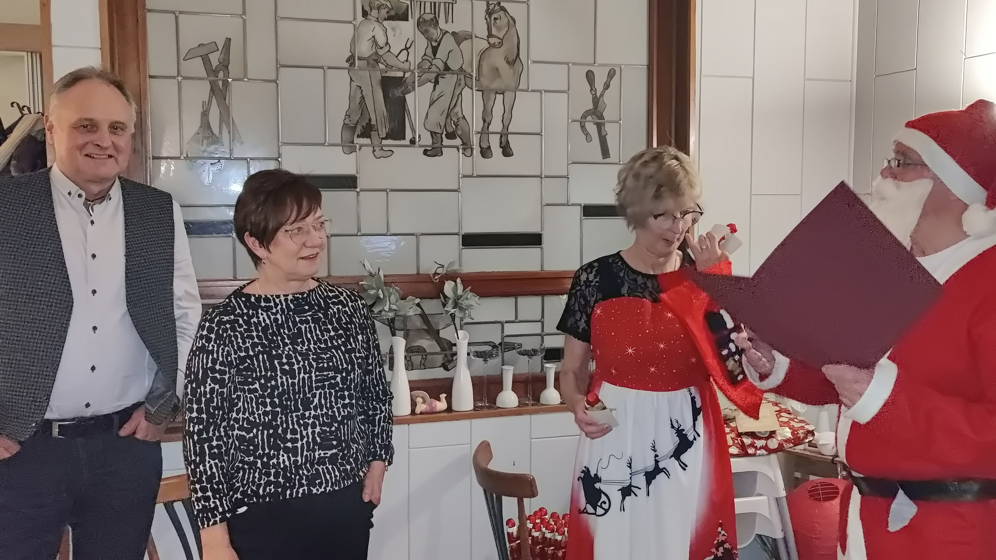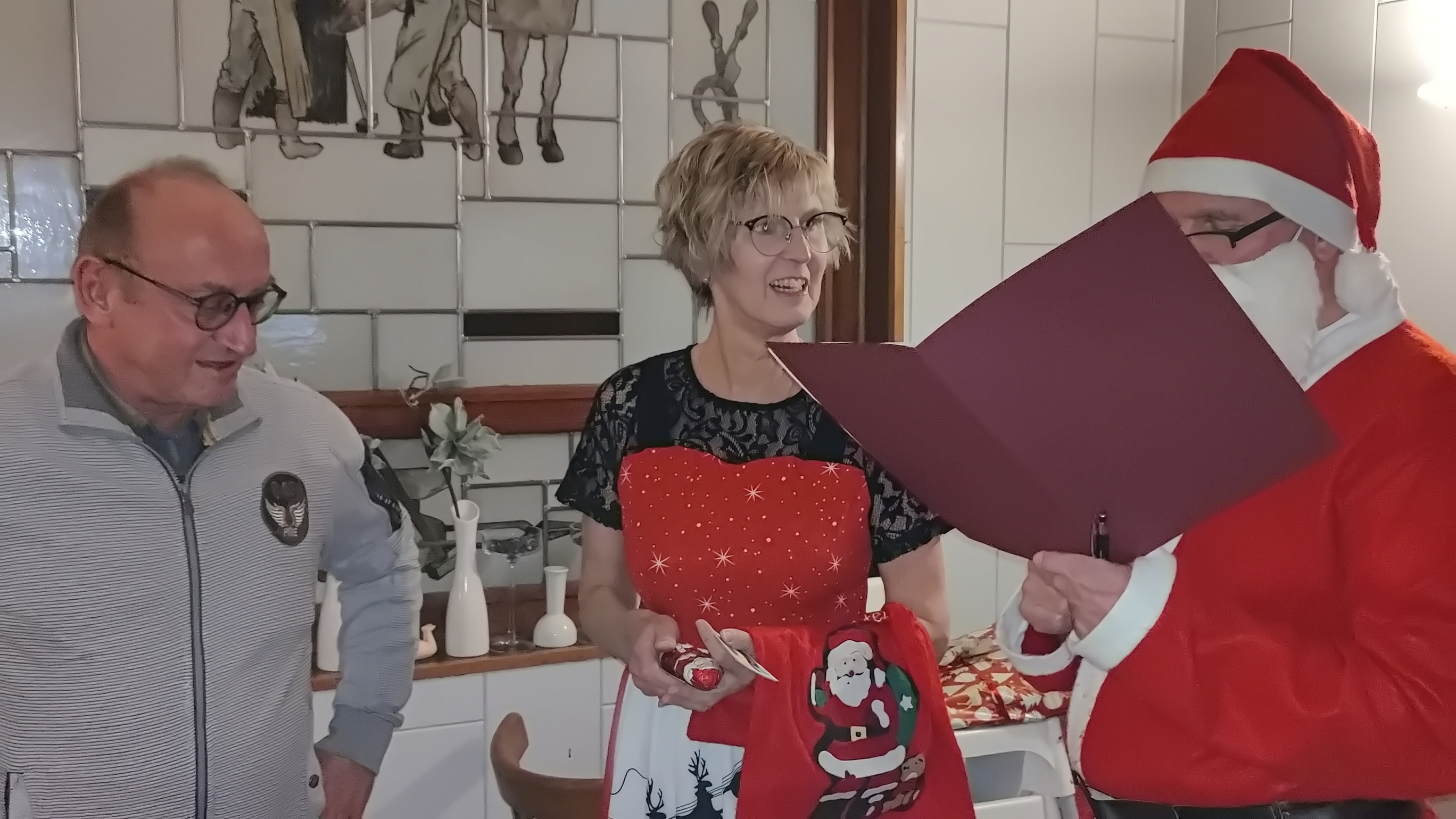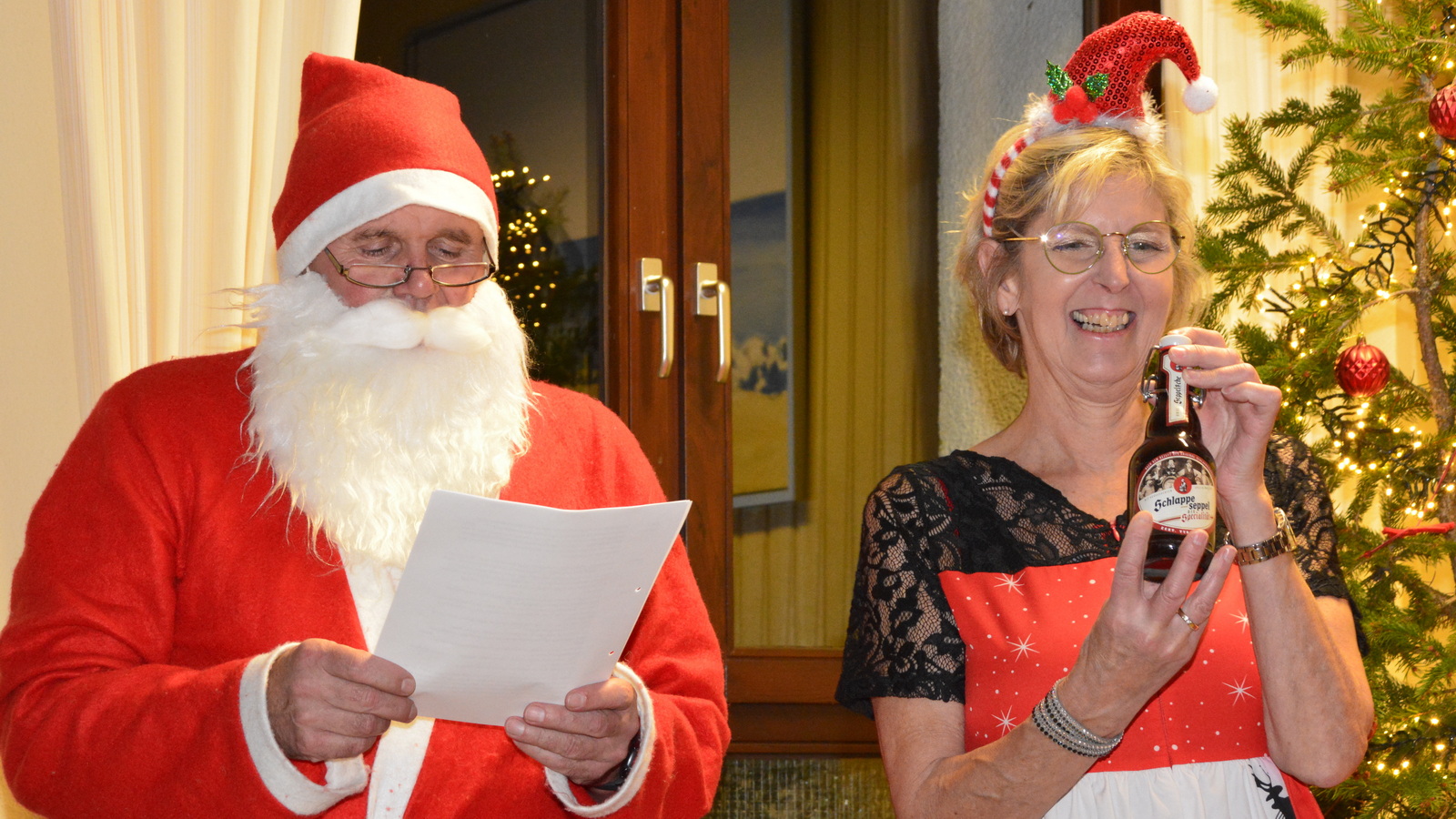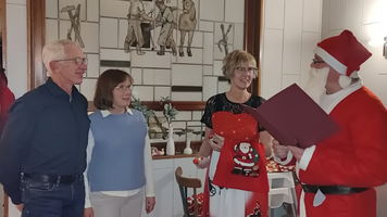 Zu der anschließenden Weihnachtsfeier hatte sich auch Santa Claus mit weiblicher Begleitung angekündigt. Sie ließen aber der Truppe Zeit um sich vorab zu stärken. Natürlich kamen sie dann auch nicht mit leeren Händen. Aus seinen Notizen stellte der Nikolaus die kleinen und großen Mängel, wie auch die positiven Ereignisse der einzelnen Spieler in den Vordergrund. Tolle Preise konnte man bei der Tombola gewinnen, die Rita und Thomas vorbereitet hatten. Unser Herbert hatte das Vereinsgeschehen der letzten 40 Vereinsjahre in einer sehr gelungenen Foto- und Dia-Show mit Hilfe von Kathrin auf die Leinwand gezaubert. Folglich wurde viel gelacht und noch lange in den Abend hineingefeiert.